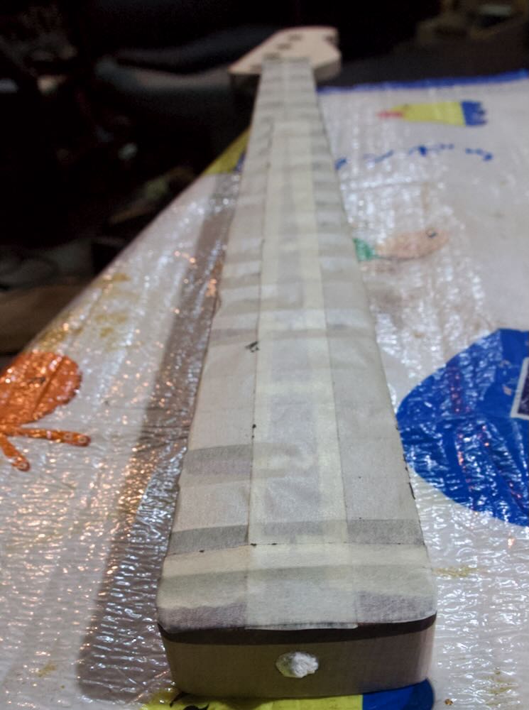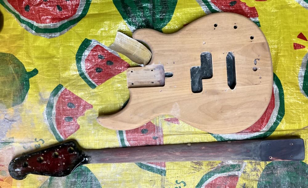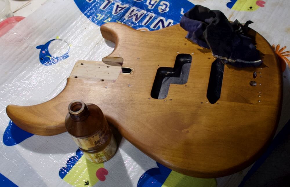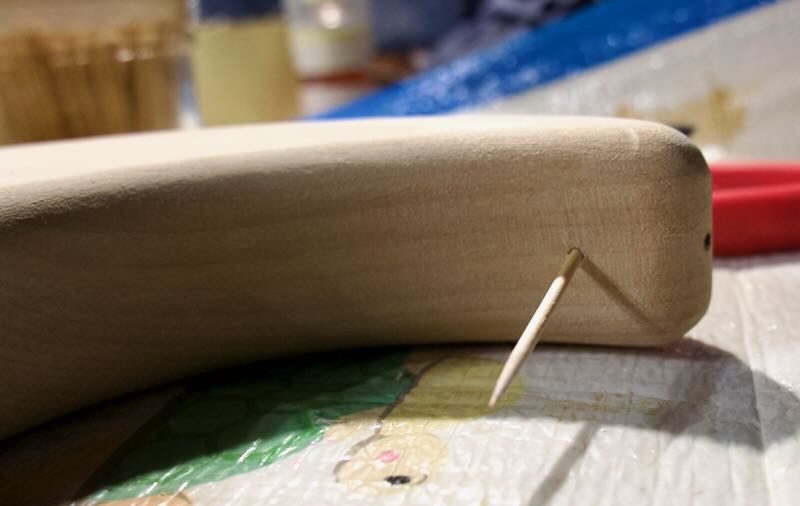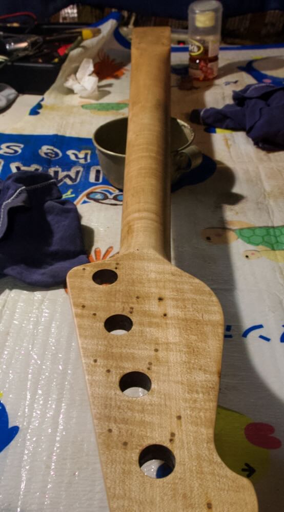 トラ杢も出てきまして、いい感じになってきました。ヘッドにはなんだか色々ネジ穴が開いておりましたので、不要な穴は、爪楊枝とエポキシ接着剤で埋めました。