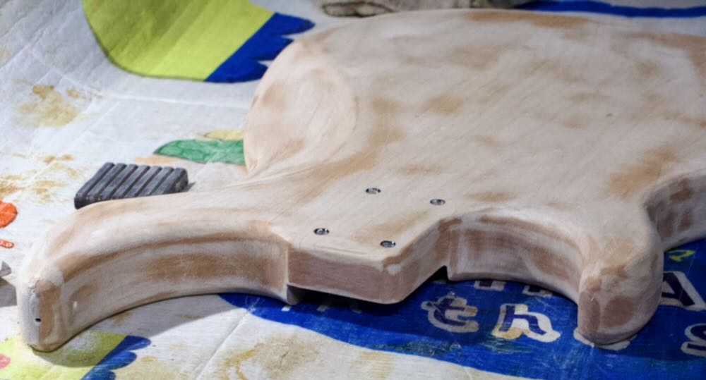 部屋にある、ネックの木っ端(メイプル)から切り出して、整形、穴あけ。ボディーと同じオイルフィニッシュ剤を塗り重ね塗り重ね・・