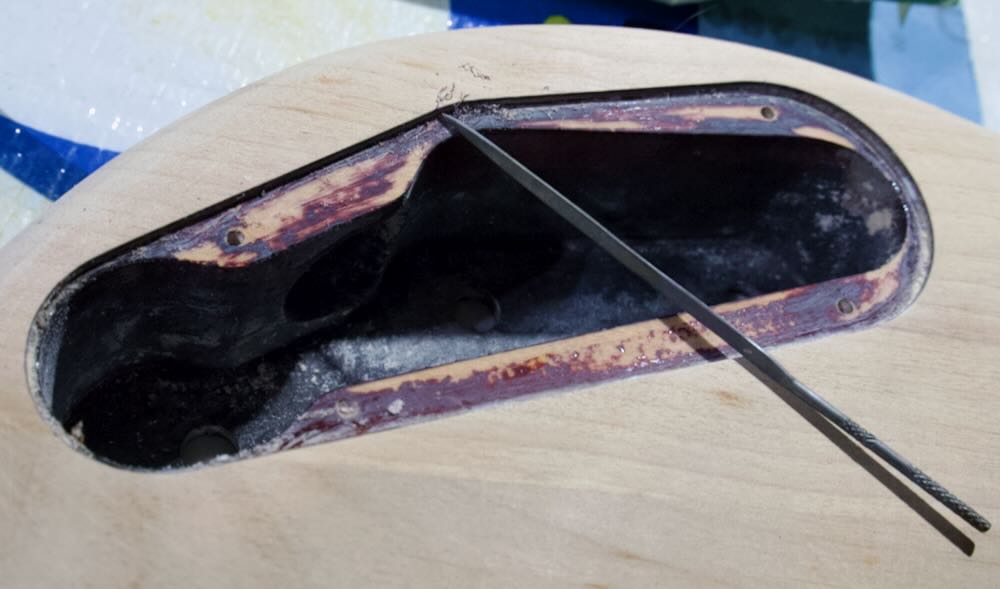 このボディーは、なかなか下地の処理がしっかりしているのか、完全手作業のペーパーがけはかなり時間がかかりました。オイルフィニッシュですので、下地剤が残らないように、完全に一皮剥いて、木肌を出してやります。カッタウェイの内側は、いつもながら根気がいります。