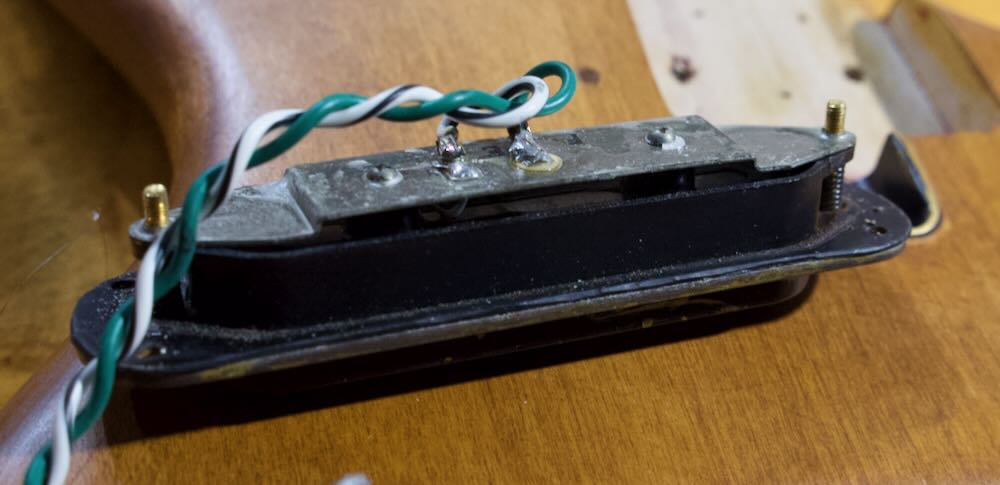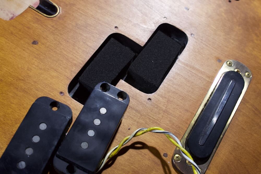 フロントピックアップは、プレベタイプですね。持ち主の方からピックアップの高さが足りない、と相談されてましたので、中にスポンジを挟みました。